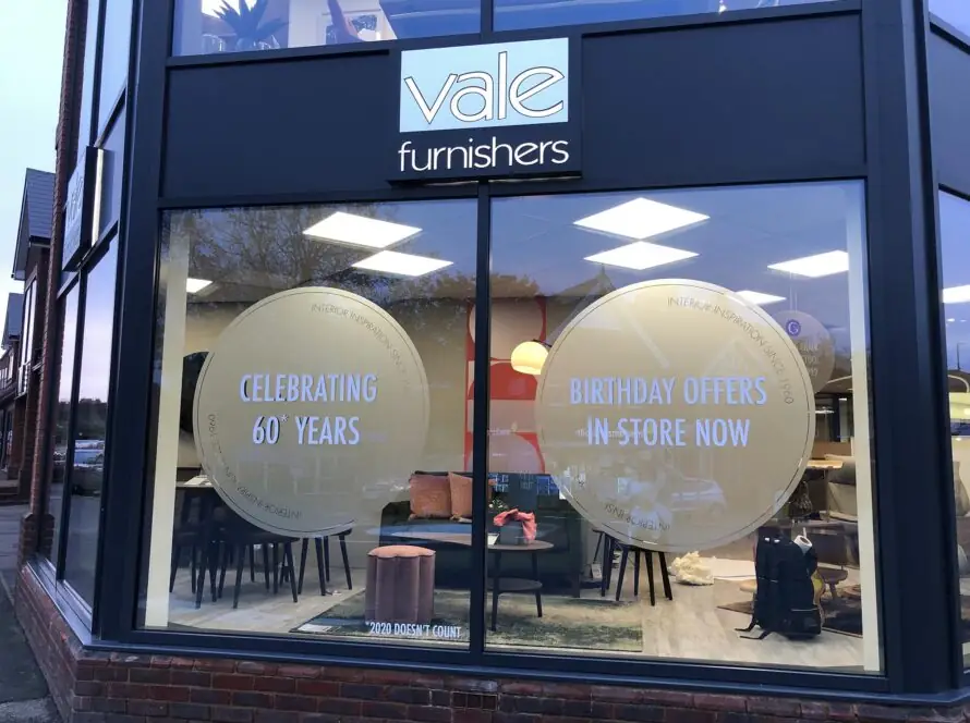 For the retail element, we created and installed custom vinyl window decals at their showrooms. These featured a combination of brand messaging, seasonal promotions, and decorative elements that reflected the style and tone of the Vale Furnishings brand. The decals were designed to enhance the frontage without obstructing visibility, drawing attention to the store while remaining clean and sophisticated. Applied with precision to large-format glass panels, they created a strong first impression for customers arriving at the showroom.
