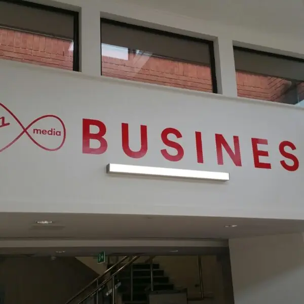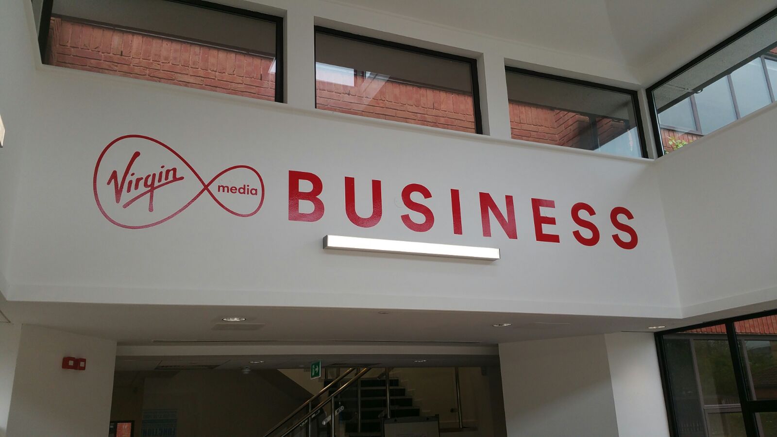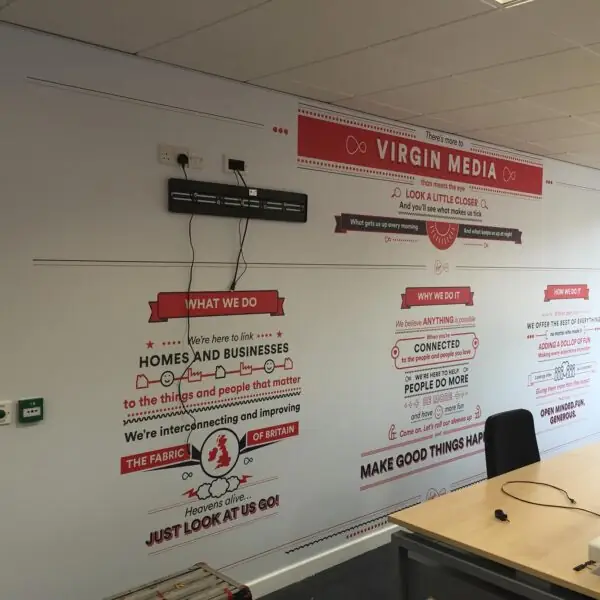 Our team produced and installed a variety of internal and external signage elements, including branded wall graphics, directional signs, and reception features. Every piece was carefully designed to align with Virgin Media’s brand guidelines, using vibrant colours, clean typography, and modern materials to create a striking yet professional environment.